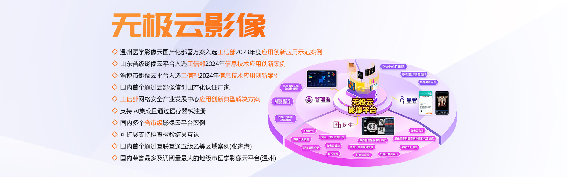 擁有多家年門診量400多萬(wàn)以上人次的大型三甲醫(yī)院全院PACS及云影像案例,多個(gè)省市規(guī)模醫(yī)學(xué)影像云平臺(tái)案例,承建的溫州市醫(yī)學(xué)影像云平臺(tái)榮獲浙江省最多跑一次改革十佳案例、省領(lǐng)跑者定位題詞、全國(guó)惠民便民優(yōu)秀案例、基于影像云AI分析試點(diǎn)單位等榮譽(yù)。